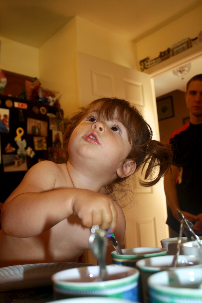 On Saturday morning, we awoke to find tasty breakfast burritos made by Grandpa. After downing those, we played with Reagan for a bit and then Jason and I headed out for a quick jog around the hilly neighborhood in VA. Once we returned, the real fun began...EGG DYING! Last year, Jason was deployed, and Reagan and I spent the holiday with the Moore's and the Petree's in Winston-Salem. Mason and Reagan weren't really old enough to dye eggs, so Brian, Lynsey and I took care of it while they napped. This year was a different story. Grandma carefully covered the kitchen table with newspaper and an assortment of dye cups, glitter, paint, stickers and wax crayons. She had already hard boiled 3 dozen eggs too. With MUCH supervision, Reagan managed to only crack 2 eggs and had a blast coloring the others: