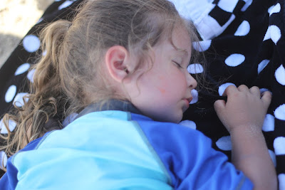 This is between when she nearly fell asleep on the sand with Uncle Geoffrey, and when I took her for a walk in the beach cart and she actually passed out!